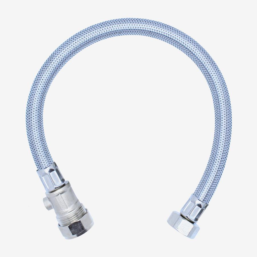 A 500mm long stainless steel industrial strength braided hose which is flexible and resistant to kinks and bends. Constructed with a 22mm isolator compression fitting at one end and a 3/4" female bsp thread at the other end. This hose has a 10 bar working pressure and a working temperature from -5°C to 90°C.