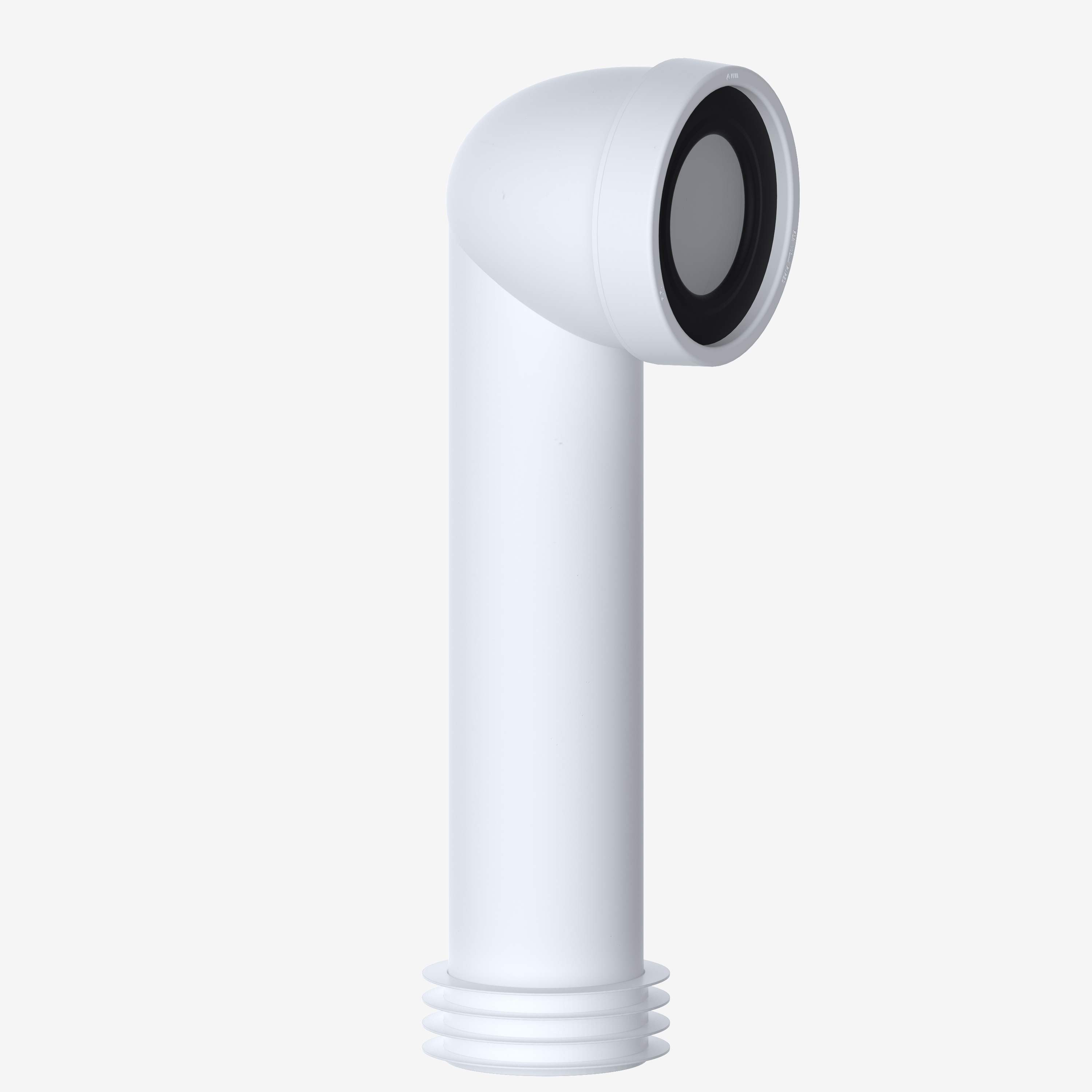 Long 90° angle rigid polypropylene WC pan connector, can also be cut to suit and is for use with 4" (110mm) pipe.